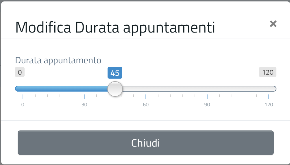 Cliccando sulla voce nel menù a tendina "DURATA APPUNTAMENTI" sarà possibile modificare la durata di ogni singolo appuntamento che potrà