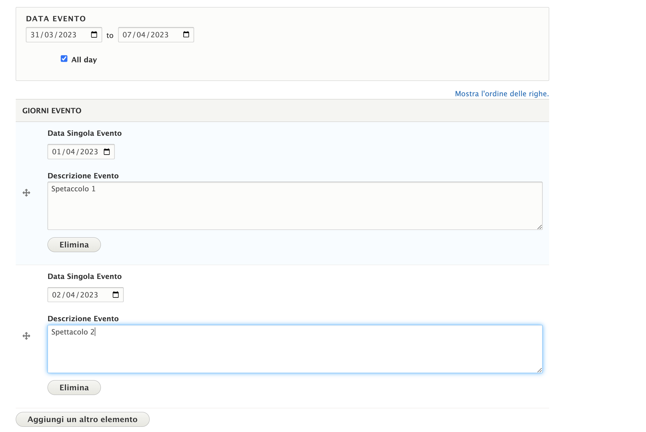 2. Nel caso in cui l'evento duri diversi giorni, come per un festival o una rassegna teatrale, è possibile indicare l'arco temporale nel box "Giorni Evento" e poi descrivere ogni singolo giorno quale evento si svolgerà, cliccando su "Aggiungi Elemento" per descrivere più giornate.